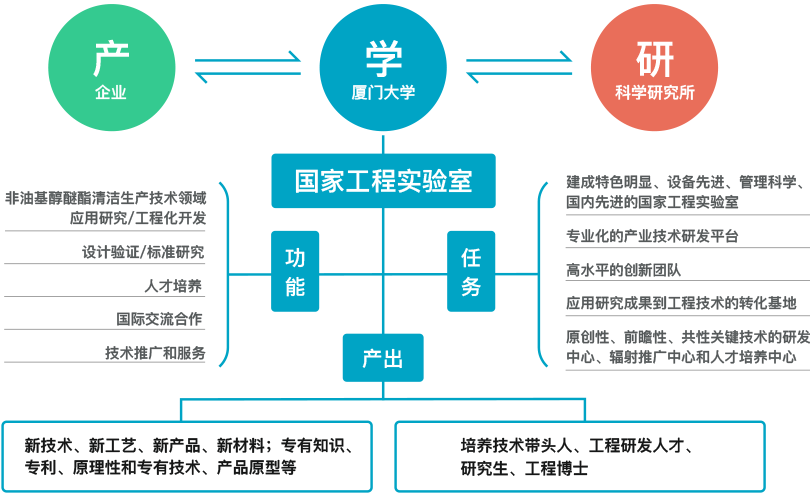 醇醚酯化工清洁生产国家工程实验室(厦门大学)(以下简称“本室”)于2008年6月经国家发改委批准启动建设,并于2012年12月28日以优秀项目顺利通过验收。本室依托厦门大学,是非法人实体研发机构,实行理事会领导和技术委员会指导下的主任负责制。本室的建设目标和任务是:围绕国家发改委批建本室的任务和目标,面向醇醚酯化工行业关键技术和清洁生产工艺需求,以醇醚酯等关键大宗化学品和碳基燃料的清洁生产及相关节能环保技术为研发方向,以全链条贯通从基础到工程化技术开发为特色,推动实现相关技术的工程化和产业化,并针对催化工艺升级和工业放大过程中遇到的困难和问题,提供具有完全自主知识产权的技术成果与工艺集成。与此同时,本室加快研发团队和科研条件的建设,积极承担国家能源化工领域相关技术攻关项目,开展与行业内工业企业的“产学研”合作。