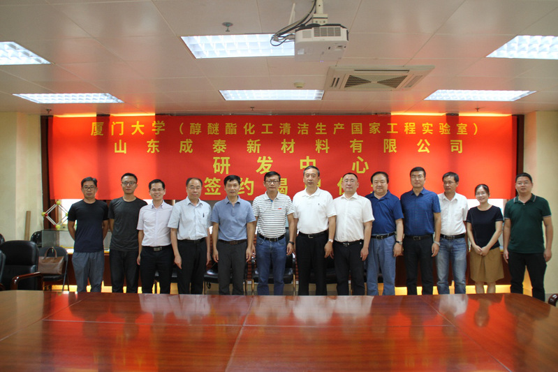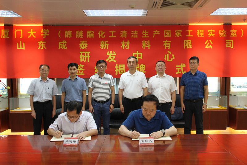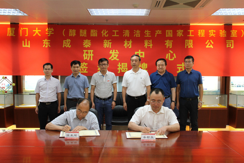 随后举行厦门大学(醇醚酯化工清洁生产国家工程实验室)-山东成泰新材料有限公司研发中心签约仪式。陈秉辉和牟哲盈代表双方签订合作协议。李中福、宋毅、王亚鹏、袁友珠、刘明久、郑进保见证签约。