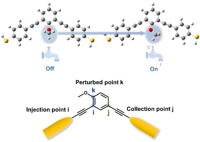 在单分子尺度下,通过分子的电荷输运会产生独特的量子干涉效应。当电子德布罗意波的相位相同时,会造成相增量子干涉效应,分子表现为高电导;反之则造成相消量子干涉效应,分子表现为低电导。量子干涉效应的研究对设计新型单分子器件具有重要意义,而现阶段对量子干涉的调控研究主要集中于锚定基团的调控、杂原子取代位点调控和共轭分子骨架调控等策略,但是这些调控策略往往意味着需要引入新的分子结构,如何发展不改变分子结构的量子干涉调控策略是现阶段单分子电子学发展的重要挑战之一。