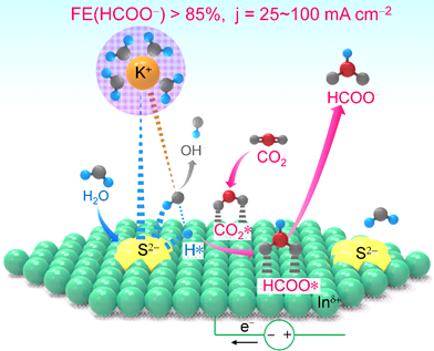 一般认为,H2O还原析氢反应是CO2还原反应的竞争反应,若促进H2O活化将降低CO2还原反应的法拉第效率。因此,基于该认识设计出的高CO2还原法拉第效率的催化剂常常活性低。王野课题组打破这种认识,提出H2O分子活化在CO2还原中起着重要的作用,成功合成出硫修饰In催化剂来活化H2O分子而促进CO2还原制甲酸的新方法,该催化剂在非常宽的电流密度范围内(25~100 mA cm-2),均可以维持85%以上的甲酸法拉第效率。在93%的甲酸法拉第效率下,甲酸的生成速率可达1449 mmol h-1 cm-2,突破了目前CO2电催化还原制甲酸生成速率的极限(1000 mmol h-1 cm-2)。通过DFT计算明确了In表面S的促进机制。将硫拓展至硒和碲等其它硫族元素以及将金属铟拓展至铋和锡等其它p区金属,均实现很好的促进效果,表明通过促进水的活化来提高CO2电催化还原性能具有普适性。该工作为理性设计高效的CO2还原电催化剂提供了新策略。