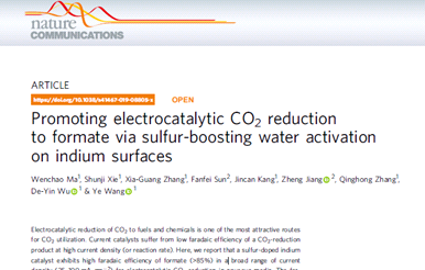 我室王野课题组与吴德印课题组合作,在二氧化碳电催化还原制甲酸的研究上取得重要突破,相关成果“Promoting electrocatalytic CO2 reduction to formate via sulfur-boosting water activation on indium surfaces”发表于Nature Communications(Nat. Commun. 2019, DOI: 10.1038/s41467-019-08805-x)。