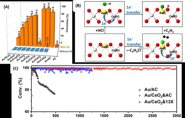 催化乙炔氢氯化反应是富煤区域生产氯乙烯单体(VCM)的关键过程,目前工业过程仍采用氯化汞(HgCl2)作为催化剂,而国际《水俣公约》要求控制和减少汞(Hg)排放,因此迫切需要开发一种实用有效的催化剂来取代汞基催化剂。袁友珠教授课题组前期研究(Chem. Sci. 2016, 7, 3181-3189; J. Rare Earths, 2017, 35, 1083-1091; Chin. J. Catal. 2016, 37, 1794-1803)和已有文献表明,Au(I)/Au(III)活性位点的循环转变被认为是Au基催化剂表面乙炔氢氯化的催化基元反应,但Au催化剂表面活性Au(I)/Au(III)物种易被过度还原为非活性的Au(0)而不可逆失活。该研究首次发现CeO2(110)晶面可将Au(0)/Au(I)物种活化回具有催化活性的循环活性位点。研究发现,普遍认为的非活性的Au(0)并非乙炔氢氯化催化过程的旁观者,而是直接参与乙炔氢氯化催化循环。CeO2(110)晶面上的Ce(IV)/Ce(III)的氧化还原对作为媒介,可以提供将Au(0)物种快速氧化成Au(I)活性位点所需的电子,最终实现高活性和高稳定性的乙炔氢氯化Au基催化剂;在乙炔氢氯化工业反应条件下Au/CeO2@AC催化剂寿命突破3000小时,相关结果已申请中国专利(201610638943.6和201711463790.7)。