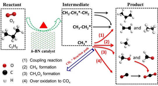 相较于传统的钒基等催化剂,h-BN催化剂在丙烷氧化脱氢方面表现出优异的烯烃选择性,除了主产物丙烯之外,还获得较高的乙烯选择性。然而,对于h-BN催化剂上丙烷氧化脱氢过程,至今仍缺乏深入的认识和理解。