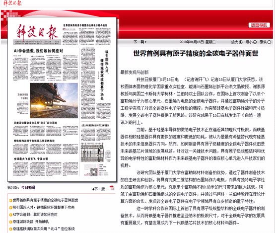 《科技日报》于4月16日以“世界首例具有原子精度的全碳电子器件面世”为题在头版报眼报道了这一成果。