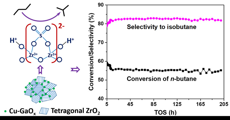 我室连奕新、杨康、赖伟坤、曹亮、赖声松等承担的上海新佑能源科技有限公司合作开发项目:固体超强酸催化正丁烷异构制备异丁烷,经过二年多探索性开发取得了重要研究进展。通过设计CuGa/ZrO2-SO42-双功能硫酸氧锆固体酸催化剂,成功实现了正丁烷氧化脱氢,丁烷/丁烯质子化,双C4分子加成与裂化,异丁烯氢转移制备异丁烷的异构化催化过程,并且经过长达200个小时的稳定性试验,催化剂无明显失活趋势,异丁烷收率均能维持在45 wt.%左右。该催化反应不仅为低碳烷烃的高效异构化生产超清洁燃油提供了可能,而且能够完全取代当前非环境友好的贵金属异构体系(Pt/Al2O3-Cl),充分满足节能减排的化工生产要求,具有重要的学术研究价值与应用前景。目前该项目已由上海新佑能源科技公司牵头设计,将在广西新鑫化工能源公司建设千吨级规模中试生产装置。