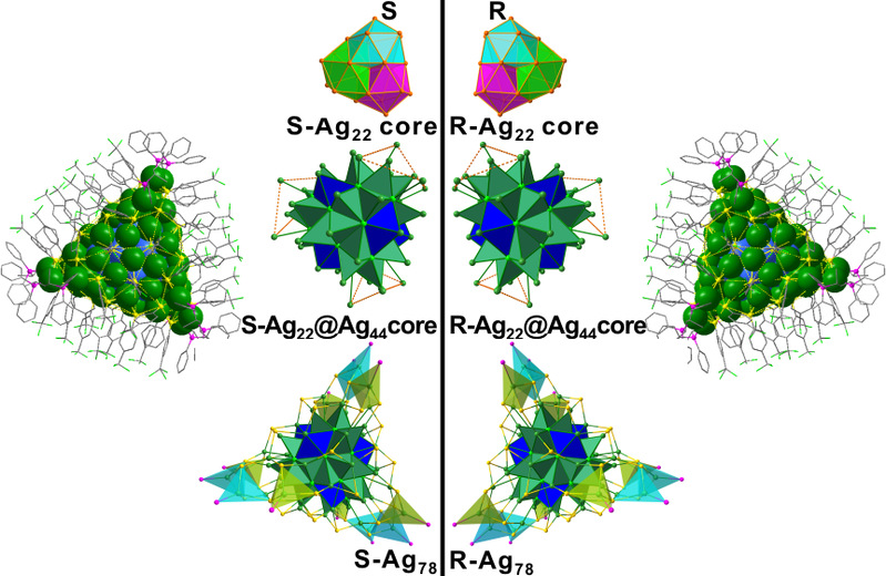 手性是大自然的基本属性。手性化学的发展建立了系列合成手性分子的有效方法,并因此推动了手性化合物的广泛应用。近年,手性纳米材料的研究也越来越受到大家的重视,它们的重要应用潜力也不断被挖掘出来。然而,当前人们对这类介于分子与宏观尺度之间的纳米材料的手性的理解较为有限,也尚未建立行之有效的宏量化学合成方法。该工作报道了全新手性双金属纳米团簇Ag78的合成及其全结构。研究发现双膦与硫醇混配体的使用可作为制备手性纳米团簇的普适手段,但是由于使用的配体一般为非手性的,所得到这些手性纳米团簇通常是以外消旋体的形式存在。而通过手性柱分离(复杂耗时)或者离子对拆分(部分拆分且要求团簇带电荷)等方法,都难以实现它们的手性分离。而单晶结构分析表明,外消旋的Ag78团簇的两种手性构型与其使用的双二苯基膦丙烷中C-C-C链的取向有直接关系,因此,通过引入手性双膦,使得双膦配体中C-C-C链的取向通过手性季碳的绝对构型来固定,从而一步得到100% 光学纯R或S构型Ag78团簇。该研究为制备手性金属纳米颗粒提供了一种有效的合成策略。