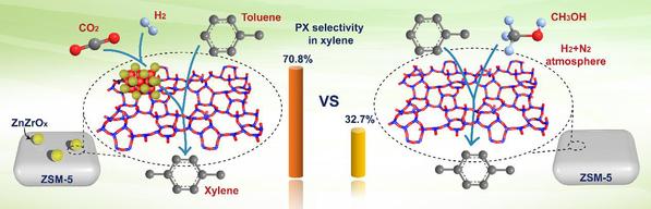 PX是石化工业的基本有机化工原料之一,主要用于生产三大合成材料—合成树脂、合成纤维和合成橡胶;随着我国下产业的快速发展,需求量迅猛增长,进口依存度居高不下,持续大于50%。采用甲醇与甲苯选择性烷基化反应制PX是一条热门且较为经济的技术路线,国内外众多研发机构和公司投入大量的人力物力进行开发研究,但反应温度为420-480 °C,与甲醇制烯烃(MTO)反应温度接近,容易产生副反应。相关研究表明,甲醇与甲苯烷基化反应温度较高的主要原因在于甲醇转化为活性烷基化的基团较为困难。鉴于此,袁友珠教授课题组在前期开展CO2加氢制甲醇的研究中(Appl. Catal. B: Environ. 2019, 251, 119; Catal. Sci. Technol. 2018, 8, 1062),注意到CO2催化加氢制甲醇经甲酸盐路径反应机理的甲氧基中间体,遂提出使用CO2和H2替代甲醇作为甲苯烷基化试剂,利用CO2和H2在相对较低温度下生成的甲氧基中间体(无需经甲醇)直接与甲苯烷基化,以期实现提高目标产物PX选择性和抑制副产物气态烃生成的目的。